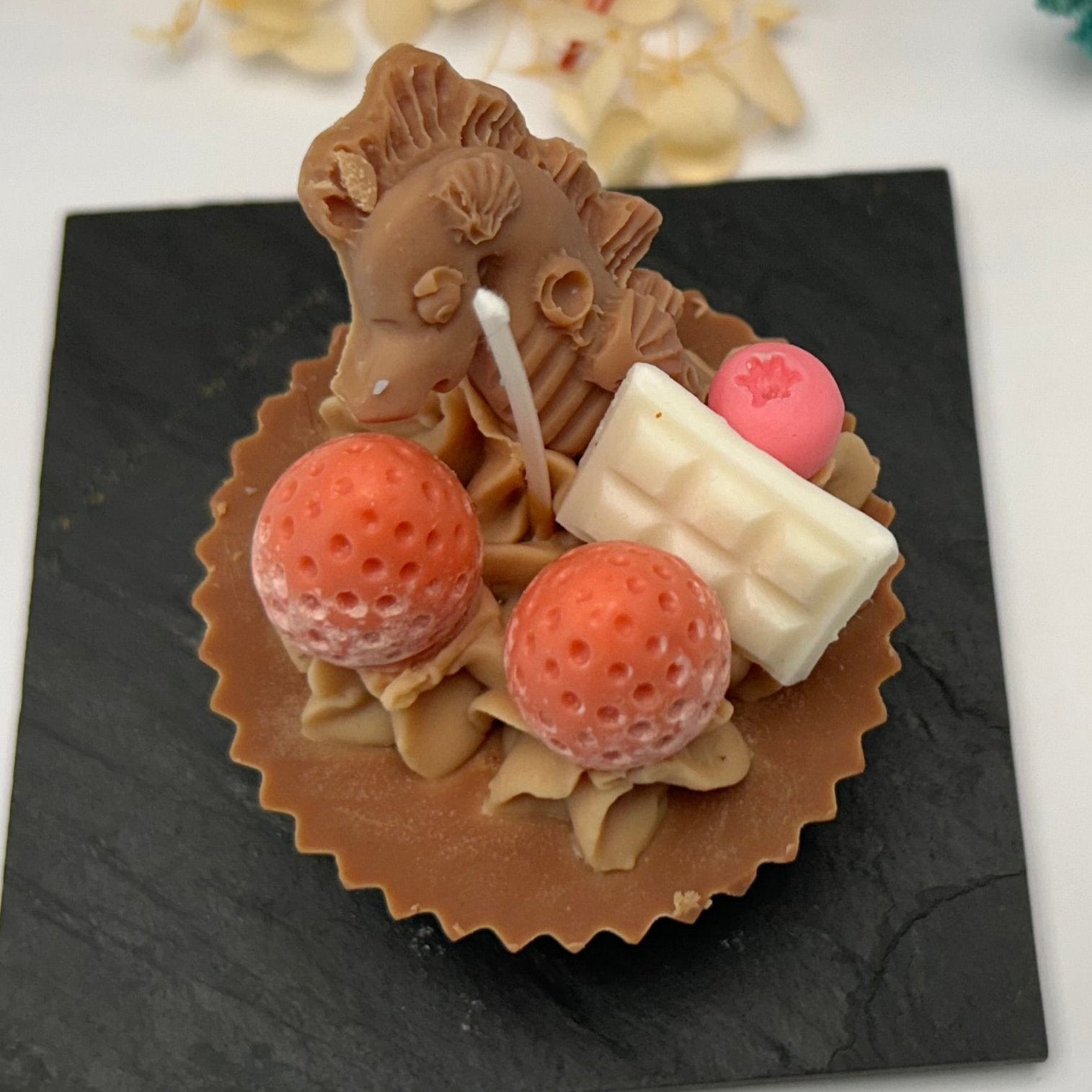 Génoise au chocolat décorée de fruits et de décorations en chocolat.