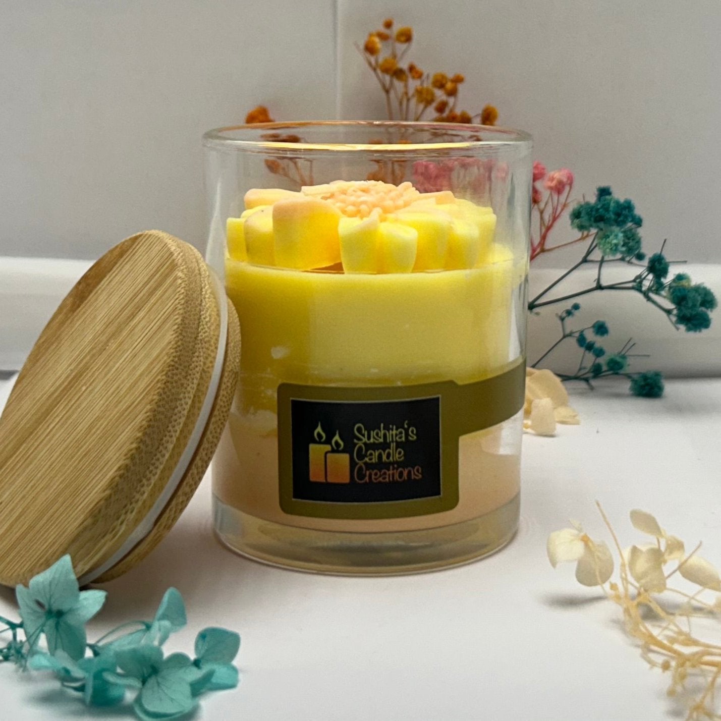 Im schönen Milchglas mit Bambusdeckel, lachsfarbener und gelber Rapswachs mit Sonnenblume in beiden Farben.
