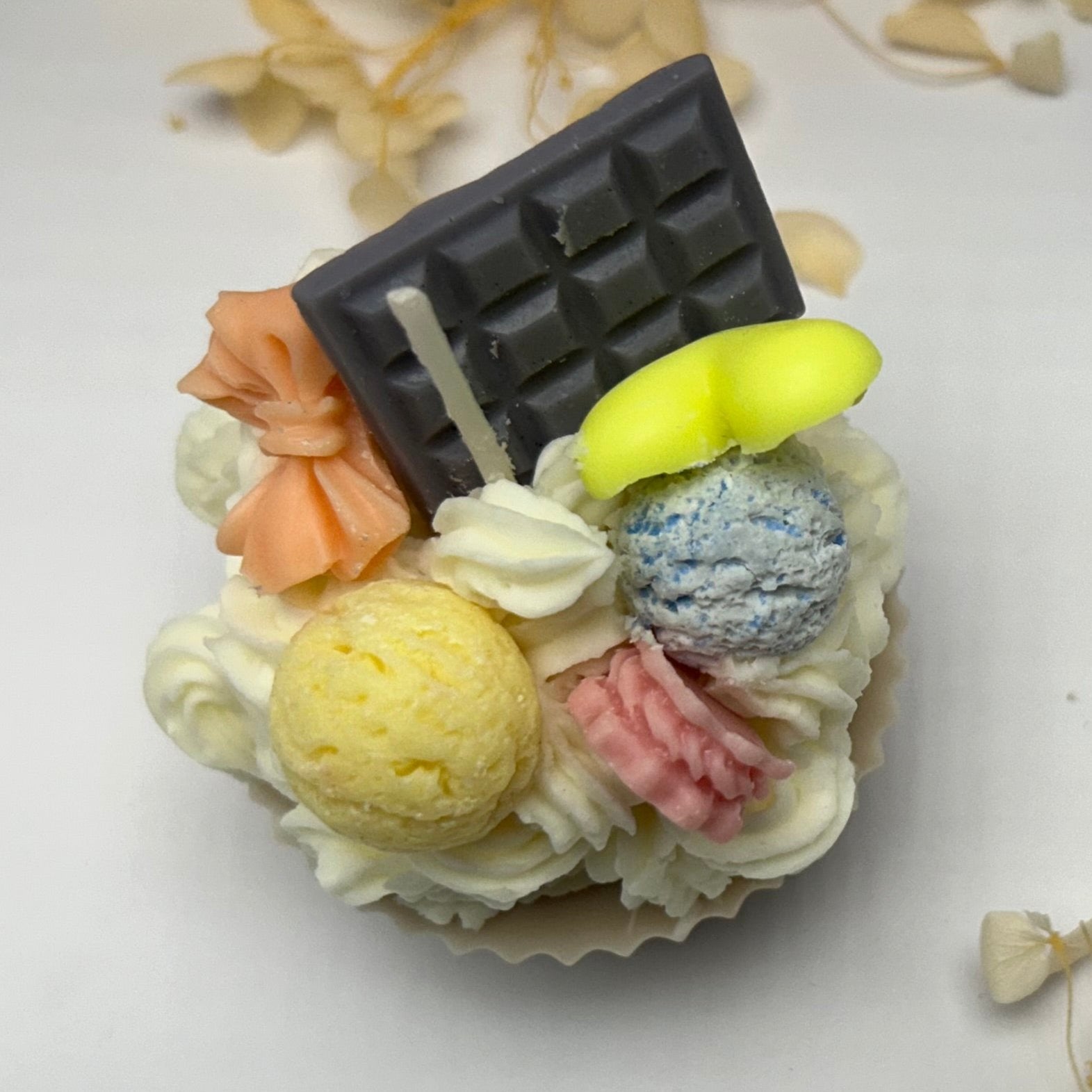 Cupcake mit Schlagsahne und farbigen Eiskugeln verziert.