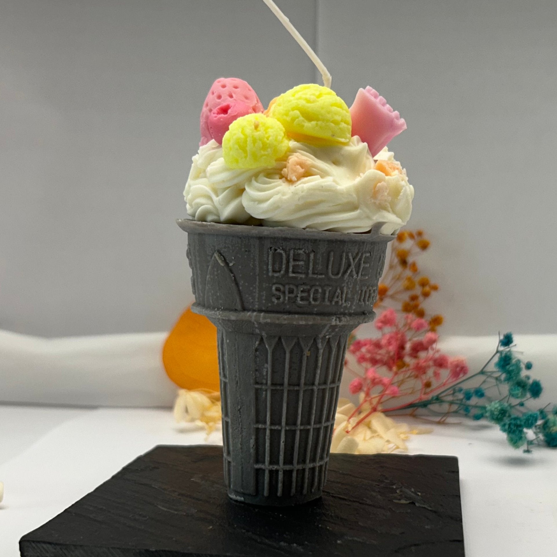 Verziert mit Schlagsahne, Schokolade und Bonbons.