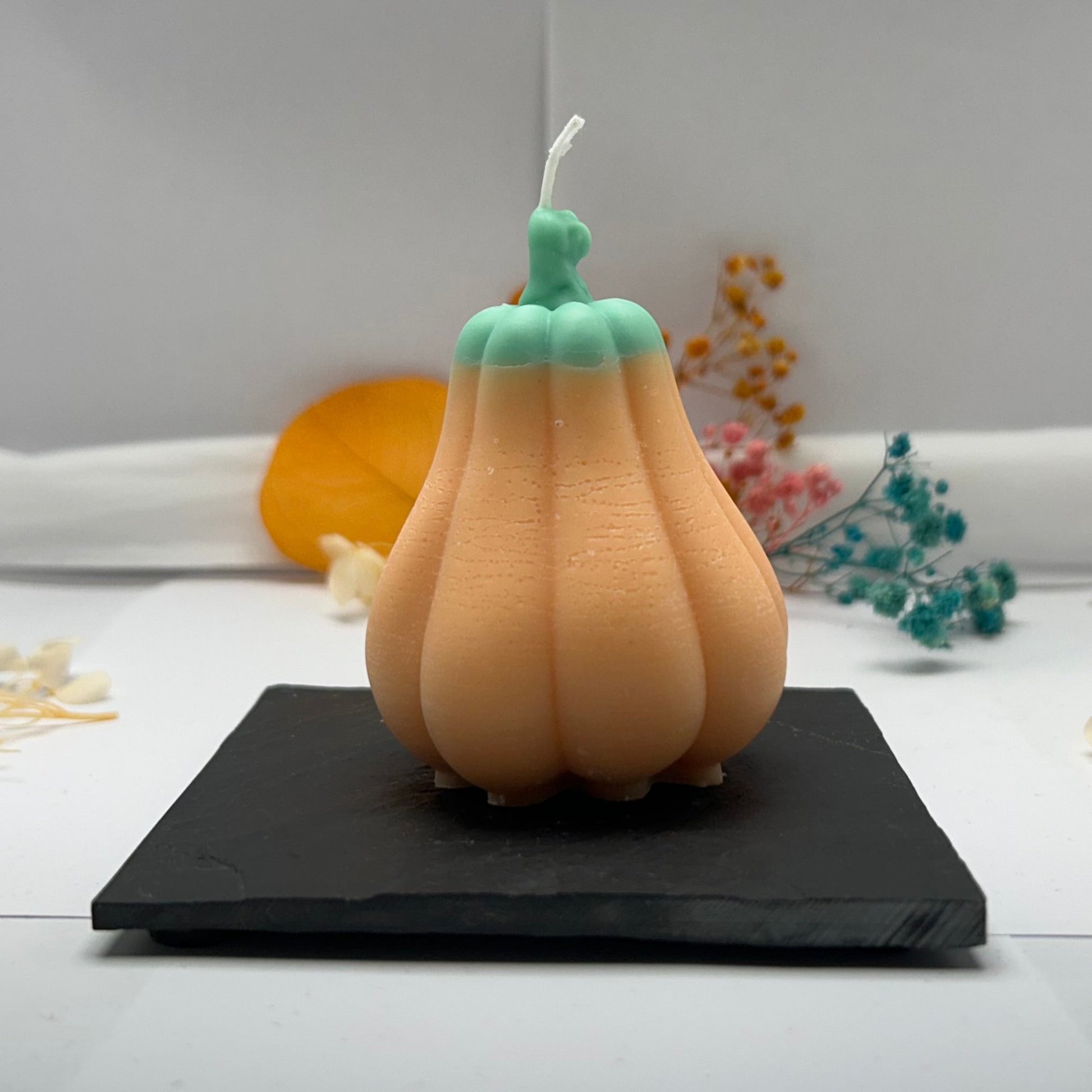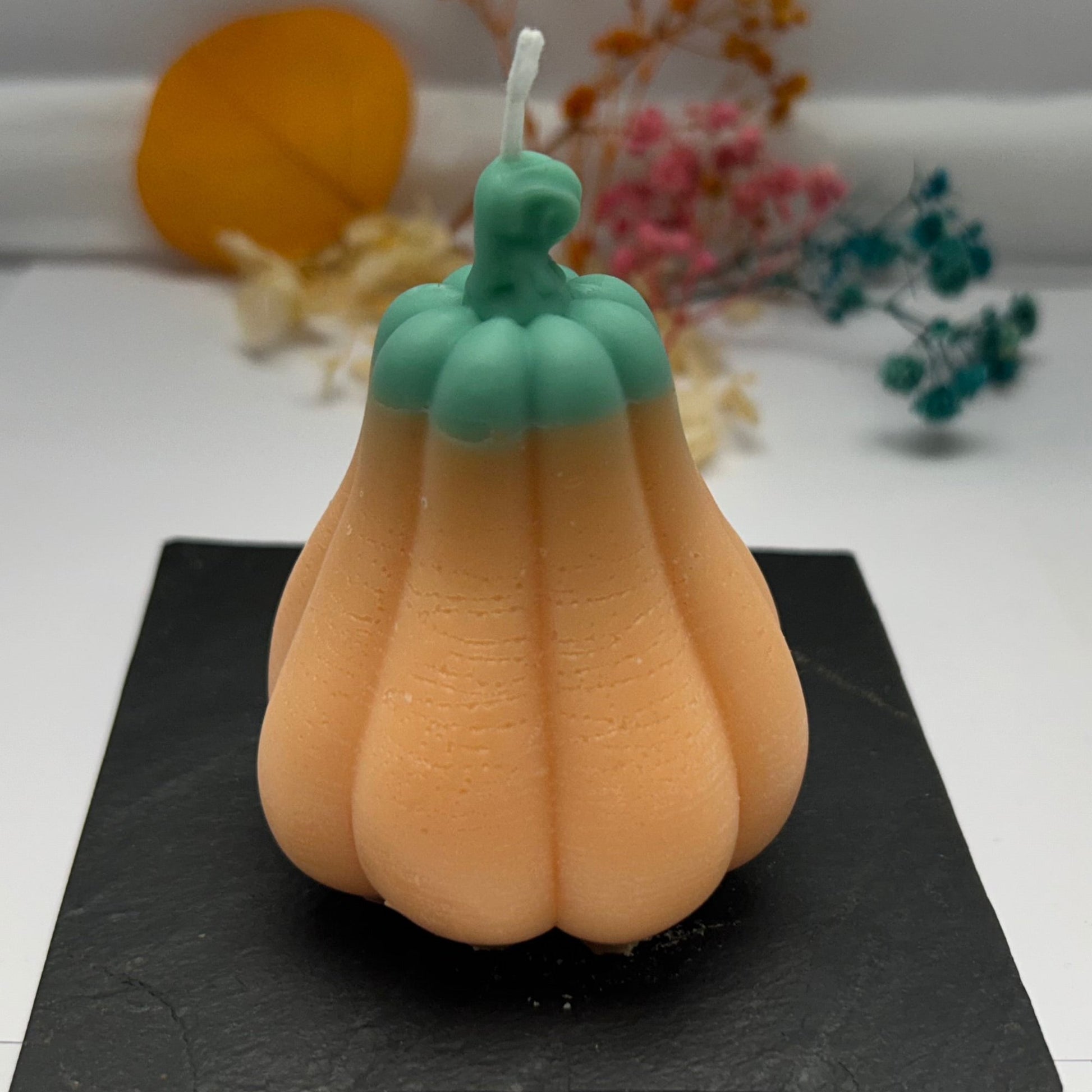 Kürbiskerze: Diese Kerze ist aus orangefarbenem Wachs und besitzt einen grünen Stiel.