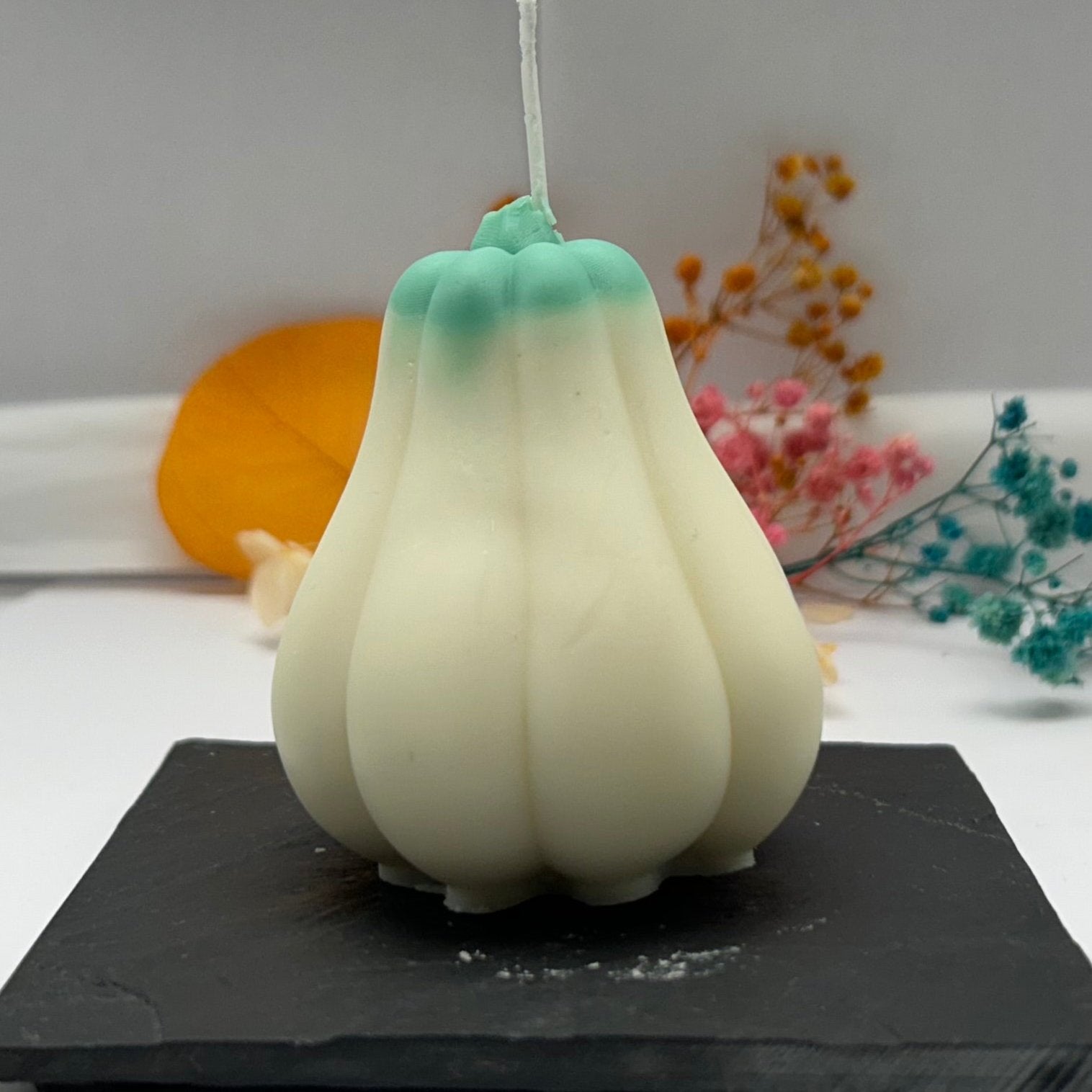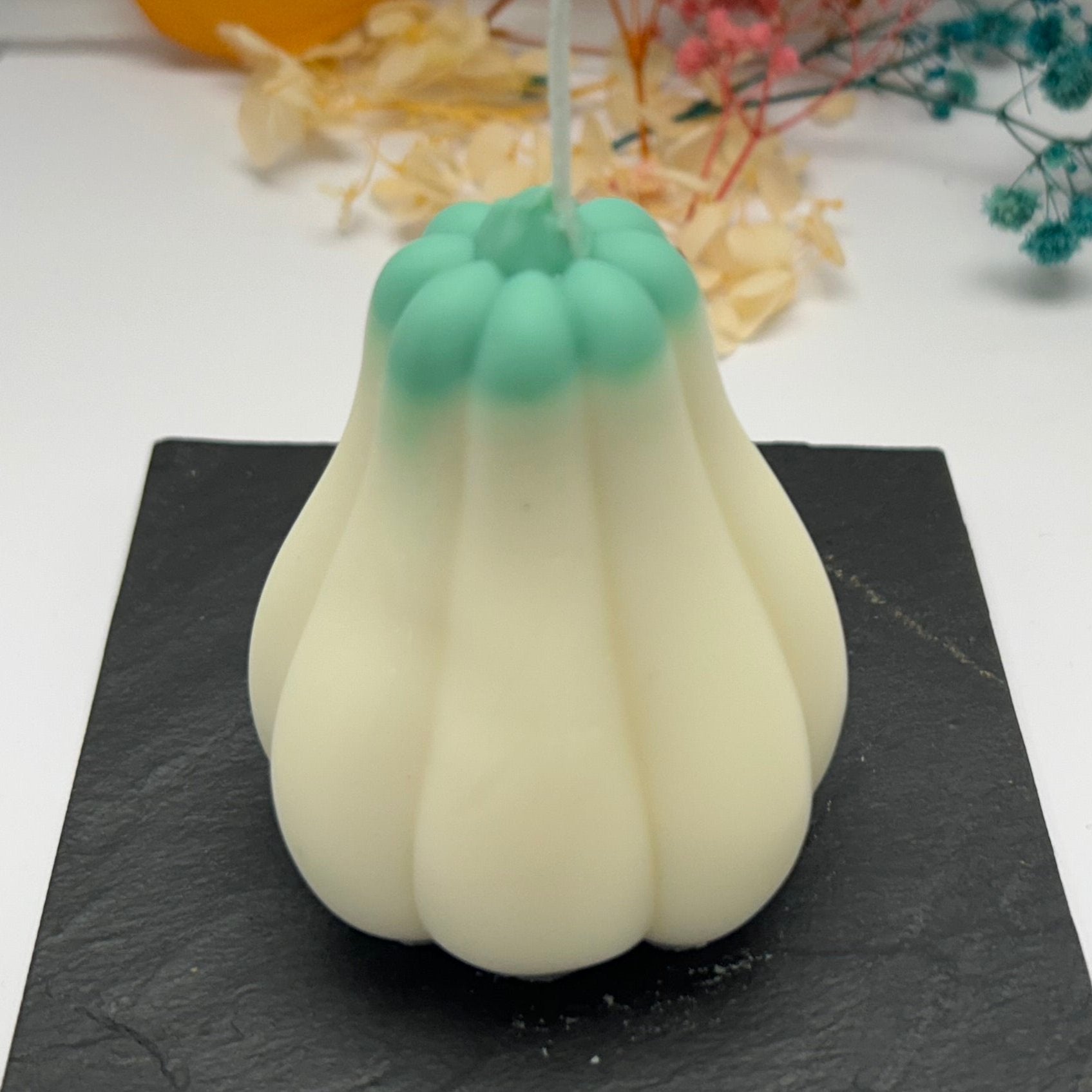 Diese Kerze besteht aus weißem und grünem Wachs und eignet sich perfekt für eine Halloween-Themendekoration.